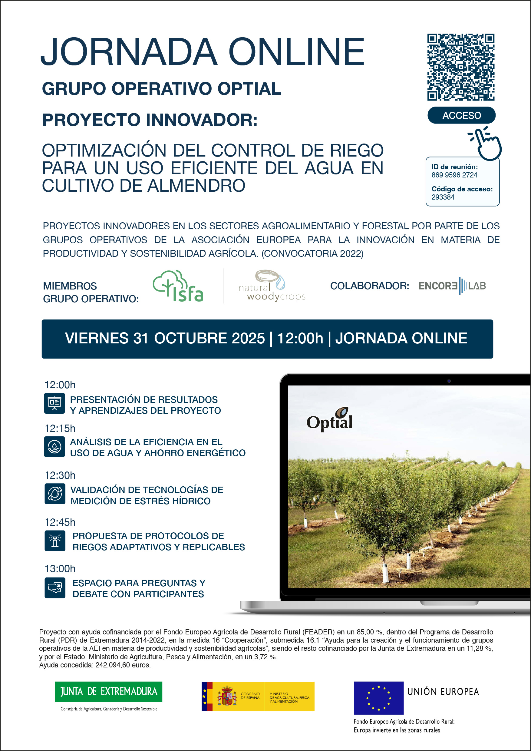 El pasado viernes 31 de octubre de 2025, tuvo lugar la jornada online de presentación de resultados y aprendizajes del proyecto OPTIAL, una iniciativa innovadora centrada en la optimización del control de riego para un uso eficiente del agua en el cultivo del almendro.